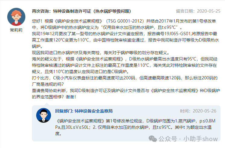 能否解释下特检院19年12月鉴定通过的锅炉设计文件鉴定报告中,最高工作温度为110℃也认可为D级锅炉,是否与17年质检总局颁布的《特种设备安全监察条例》中D级热水锅炉最高95℃相冲突?谢谢!